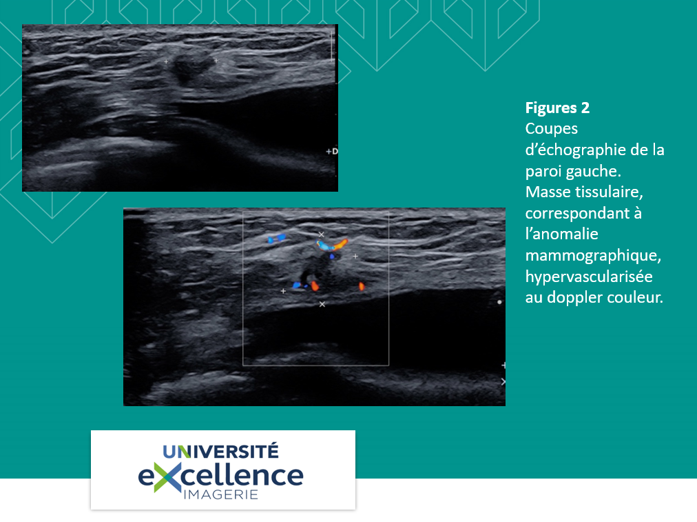 Une échographie bilatérale est réalisée, en particulier sur cette zone. Elle retrouve, en regard des quadrants supérieurs de la paroi gauche, une petite masse solide, hypoéchogène, de contours spiculés, atténuante, hypervascularisée (Figures 2).