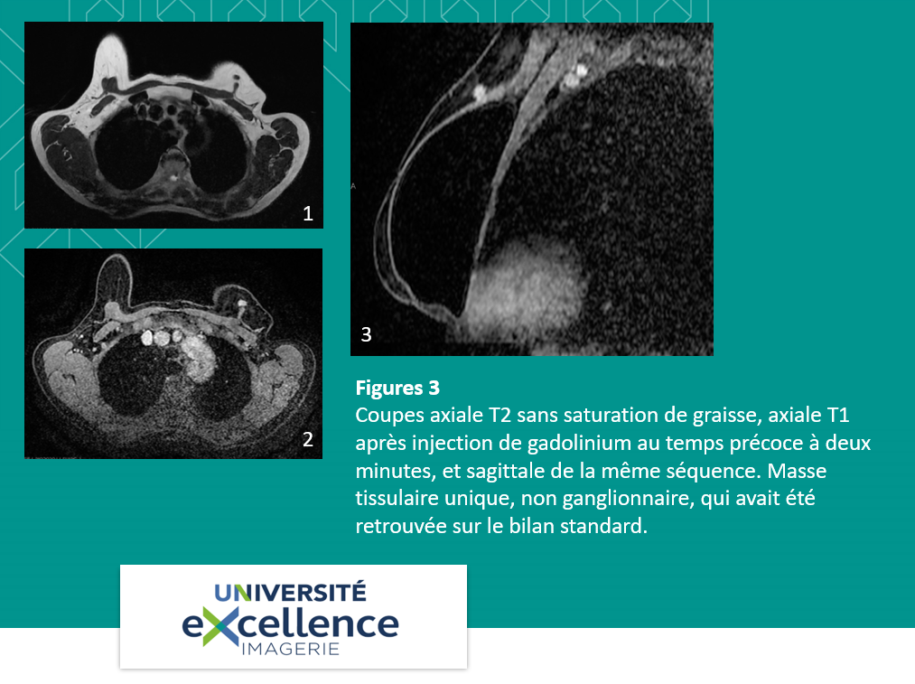 Une IRM mammaire est effectuée en complément. Elle confirme la présence d’une masse unifocale de forme mal définie, de contours discrètement spiculés, présentant une cinétique de rehaussement intense, précoce, avec Wash out, de type 3, en faveur d’une lésion maligne (Figures 3). Il n’y a pas d’adénopathie ou lésion controlatérale associées.
