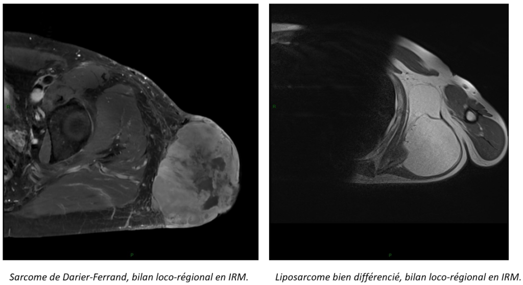 L’IRM intervient précocement dans les carcinomes avancés et les sarcomes pour caractériser l’extension en profondeur et les rapports anatomiques : dans les localisations complexes (face, cuir chevelu, régions péri-orificielles) ou en cas de suspicion d’extension profonde, musculaire, osseuse ou périnerveuse.